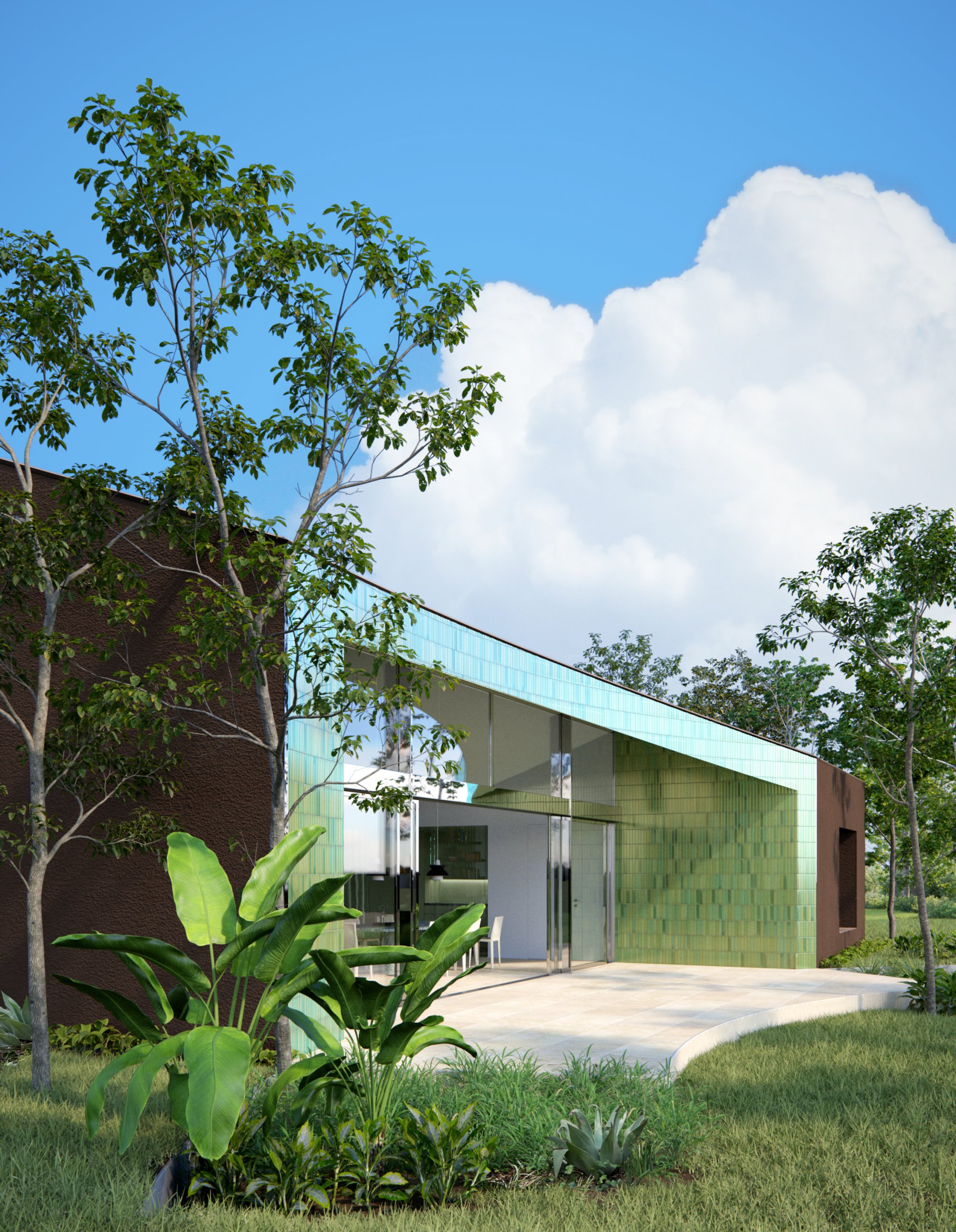 Il volume della casa è modellato mediante tagli circolari che accolgono l'ambiente esterno permettendo anche di conservare molti degli alberi preesistenti sul terreno. I tagli inoltre permettono la generazione di uno spazio esterno pavimentato ombreggiato durante la maggior parte della giornata e ampiamente utilizzabile durante la stagione calda.